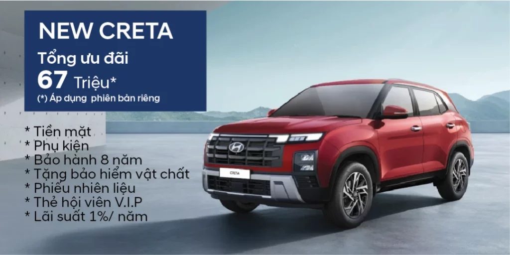 Đánh giá chi tiết Hyundai Creta 2025, hình ảnh nội thất, ngoại thất, màu xe. Khuyến mãi, giá lăn bánh tháng 10/2025. Mua bán xe Creta 2025 giá tốt, tư vấn trả góp. Các phiên bản: Creta Tiêu Chuẩn, Creta Đặc Biệt, Creta Cao Cấp, Creta N Line.